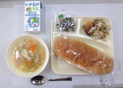 鶏肉とじゃがいものスープ煮、きのこドリア、ミニフィッシュ、コッペパン、マーガリン、牛乳です。