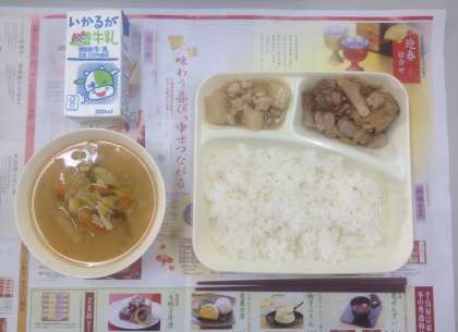 豚肉のしょうが焼き、みそ汁、だいこんと鶏肉の煮物、ご飯、牛乳です。