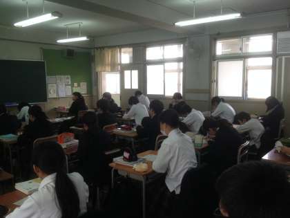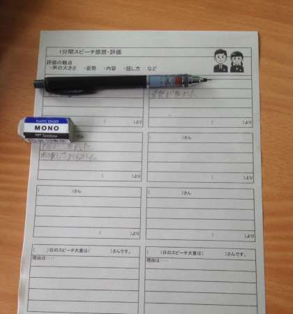 クラス全員が1分間スピーチをおこなっています。クラスメイトの感想も記入しています。