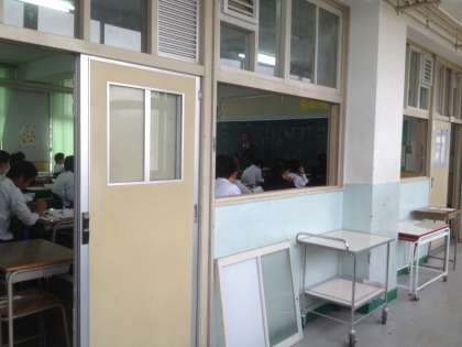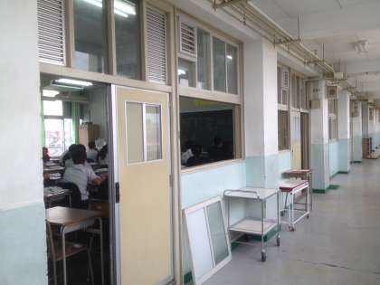 こちらは教室の扉、窓を全て取り外して、授業をおこなっています。