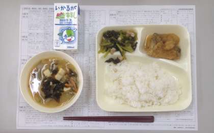 鯖(さば)のみぞれかけ、みそ汁、小松菜と鶏肉のお浸し、ご飯、牛乳です。