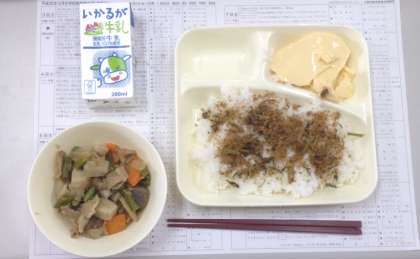 卵どうふ、豚肉と里芋の煮物、おかかなっ葉、ご飯、牛乳です。