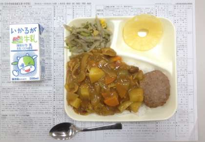 豚肉と金時豆のカレーライス、焼きハンバーグ、ごぼうサラダ、パインアップル、牛乳です。