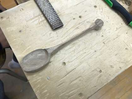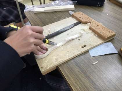 今1年生では『木製スプーンとフォーク』を制作しています。電動糸ノコや彫刻刀を使って完成に向けて頑張っています!