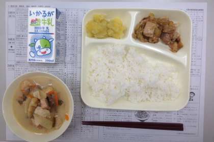 鶏肉の甘辛焼き、鮭のかす汁、栗きんとん、ご飯、牛乳、アーモンドフィッシュです。