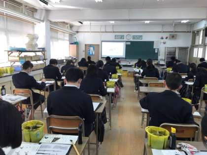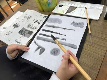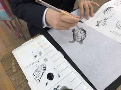 2年生では墨絵を使ったランプシェードを作っています。今日は墨で絵を描く練習です。