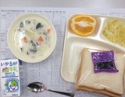 ほうれん草のクリームシチュー、キャベツのサラダ、いよかん、食パン、ブルーべりーのジャム、牛乳です。