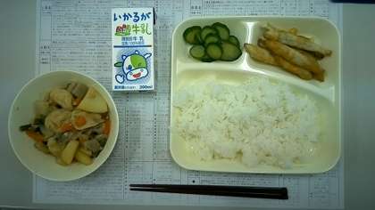 きびなごの天ぷら、一口がんもと大根の煮物、あっさりきゅうり、ご飯、牛乳です。