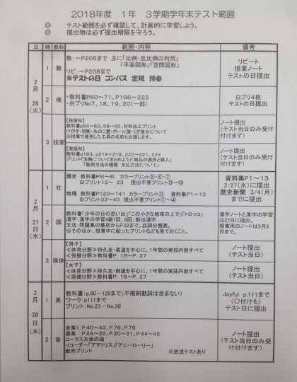 1年生の学年末テスト時間割