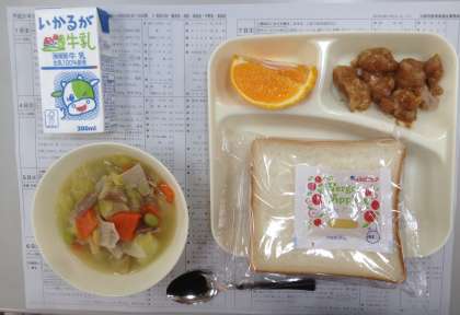 鶏肉の味噌バターソースがけ、豚肉と野菜のスープ、デコポン、食パン、リンゴジャム、牛乳です。
