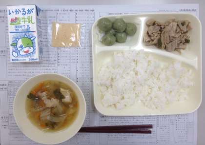 豚肉とレンコンの炒め物、鶏肉のすまし汁、きな粉よもぎ団子、ご飯、牛乳です。
