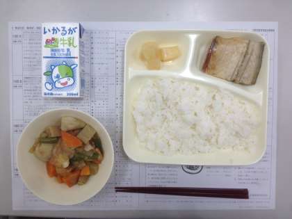 サバの塩焼き、厚揚げとサトイモの煮物、ダイコンのみそ煮、ご飯、牛乳です。