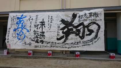 文化祭で三年生が書いた書道パフォーマンスの作品に、1、2年生がメッセージを書きました。