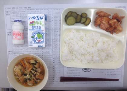 鶏肉のケチャップ煮、中華煮、きゅうりの中華あえ、はっ酵乳、ご飯、牛乳です。