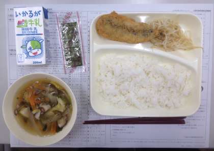 いわしのフライ、五目汁、もやし炒め、ご飯、焼きのり、牛乳です。