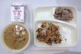 サケと小松菜のご飯、きざみのり、豚肉とレンコンの甘辛炒め、冬野菜のみそ汁、牛乳 ...