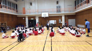 レクリエーション大会も終わり、体育室でメロンパンとスポーツ飲料をとっています。