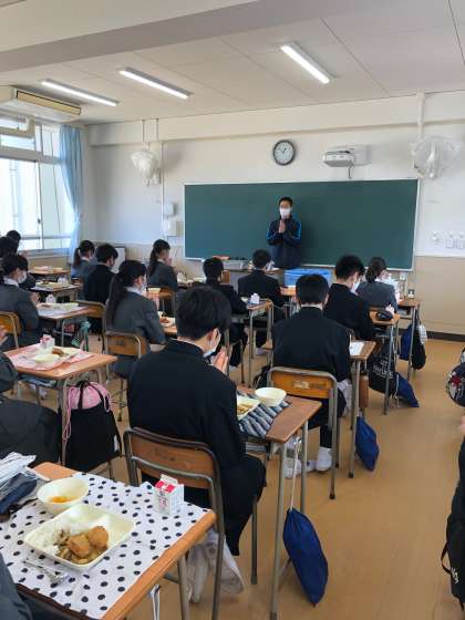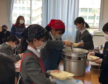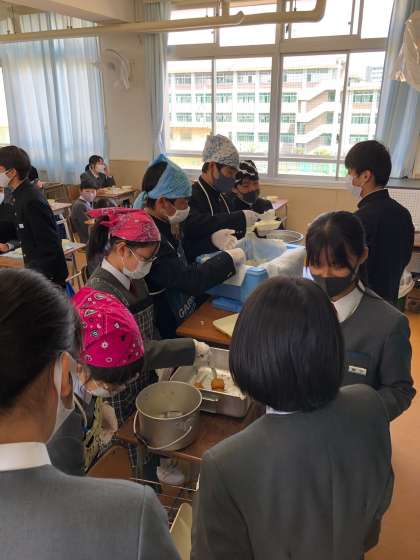 係生徒が手際よく配膳しています。みんなでおいしくいただきます。