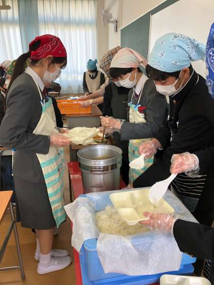 今日は人気メニュー、カツカレーライスです。係生徒が上手によそっていました。