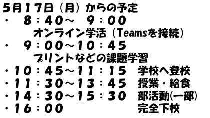 5月17日(月)からの登校時間や時程を次のようにいたします。時間割は各担任からお知らせしています。