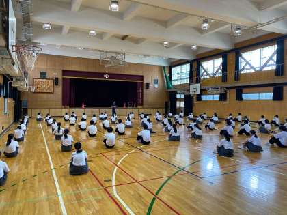 久しぶりの学年集会です! 時間までに登校し、きちんと整列できています。