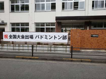 全国大会に出場したバドミントン部を記念して横断幕を正門横に掲示しました。