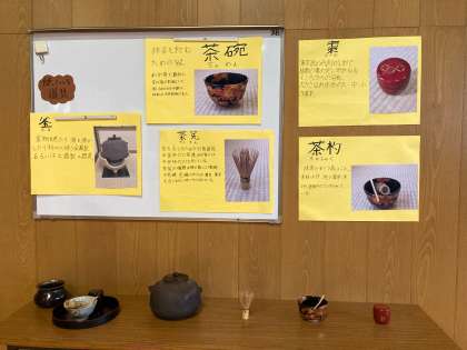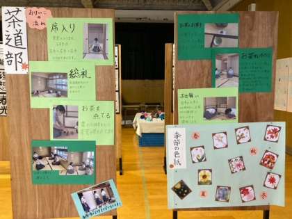 茶道部では、練習風景と、道具の説明。部員が作成した掛け軸用のミニ色紙を展示しました。