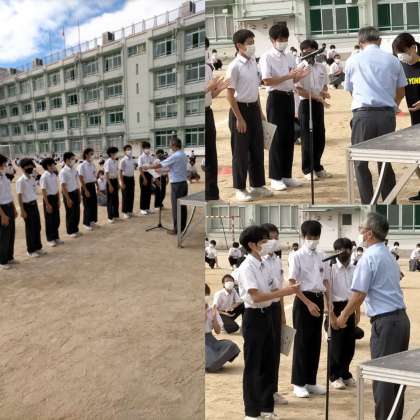 昨日の全校集会で大阪市秋季総体、バドミントン男子団体の部の表彰を行いました。表彰の後、キャプテンが全校生徒に向かって大きな声で、応援に対してのお礼や今後の決意などを述べていました。