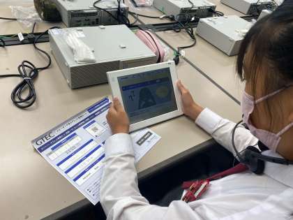 タブレットとヘッドセットを使って、英語を話す様子を録音します。