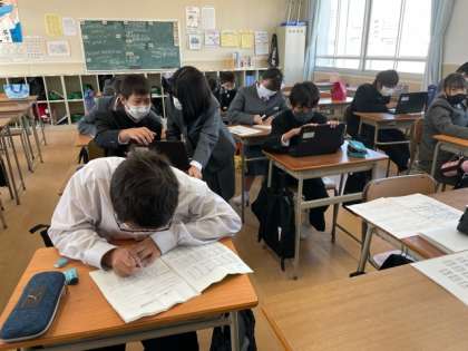 1年生は帰ってきたグループから発表準備をタブレットを使って作っています。