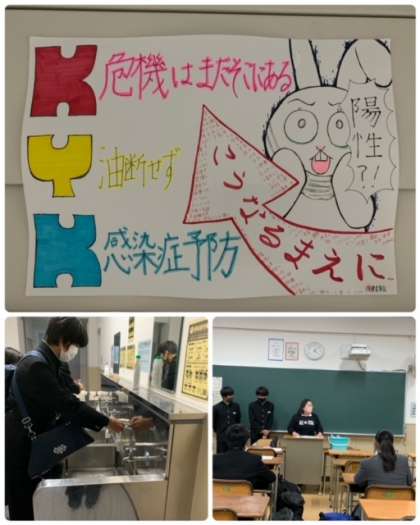 保健委員会では、目標「K危機はまだそこにある Y油断せず K感染症予防」を皆で実行できるように、石けん・ハンドソープ・アルコールがなくならないよう目を光らせ、補充を行います。また毎日1時間に1回教室の喚起を実施します。皆さんご協力をお願いいたします。