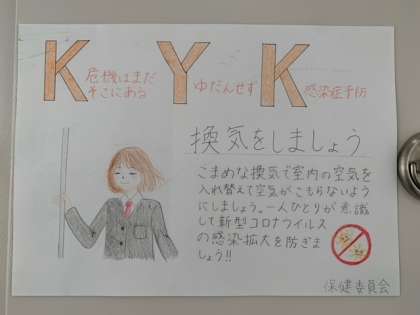 保健委員会では、目標「K危機はまだそこにある Yゆだんせず K感染症予防」を皆で実行できるように、石けん・ハンドソープ・アルコールがなくならないよう目を光らせ、補充を行います。また毎日1時間に1回教室の喚起を実施し、加湿器の点検や水の補充を行います。喚起については、寒い中つらいでしょうが、温かい下着を工夫するなどをして、皆さんご協力をお願いいたします。