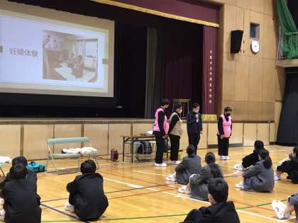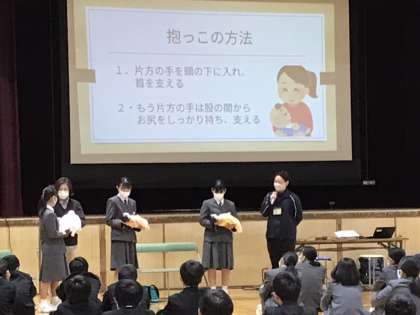 1年生は性教育で講師の方をお招きして、新生児の抱っこの方法を教わったり、妊婦体験をさせていただきました。