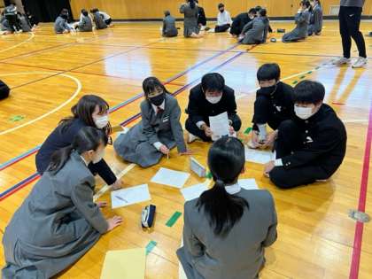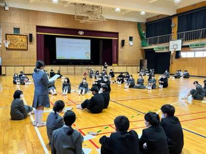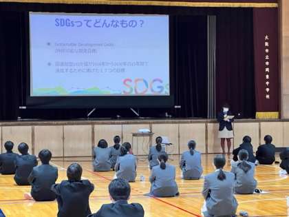 2年生全員を前に、堂々と授業をしており、中学生の生徒らも、「SDGs」について意欲的に取り組むことができていました。