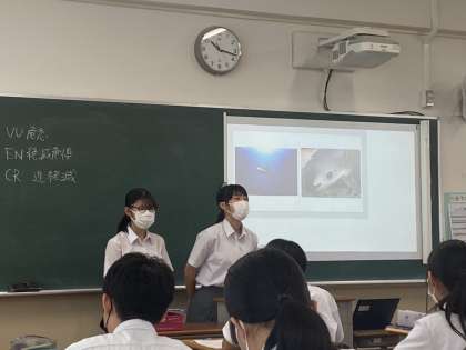 教科書で絶滅のおそれのある動物について読んだあと、レッドリストに載っている動物をひとつずつ選びグループごとに発表しました。