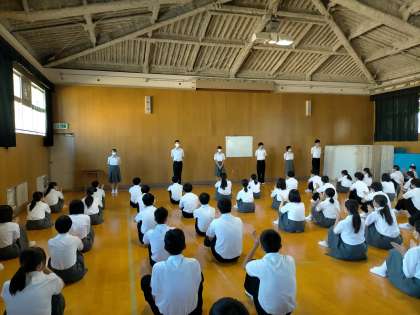 週明け月曜日で前期と後期の委員会が入れ替わります。そこで前期の半年間、学年、クラスを引っ張ってくれた学級代表から学年生徒に話をしてもらいました。