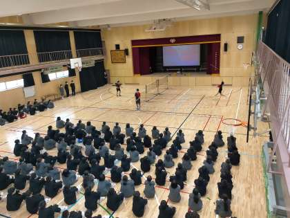 今日から体験入部が始まります。 写真はバドミントン部の紹介です。
