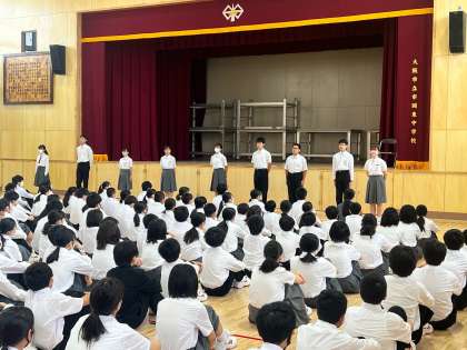 全校集会が体育館で行われました! 各委員長による委員会報告の様子です!