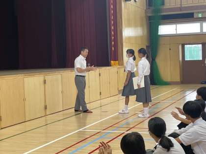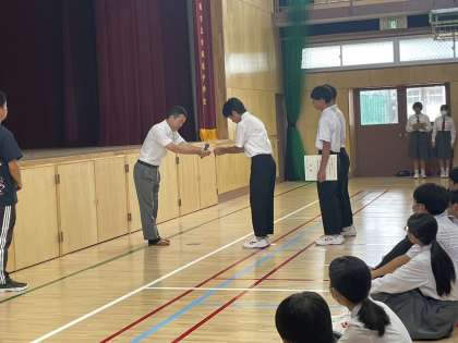 全校集会にてハンドボール部の表彰が行われました。
