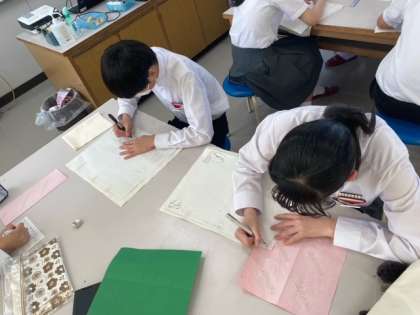 題材は「オリジナルランチョンマットを作ろう」で、今日はそれぞれの生徒が考えたデザイン画を布にチャコペーパーで転写する時間でした。
