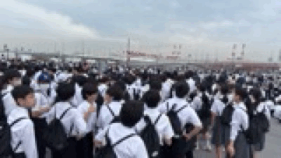 学校出発して、夢洲駅に到着しました。少し混んできたようですが、これからゲートに向かいます。