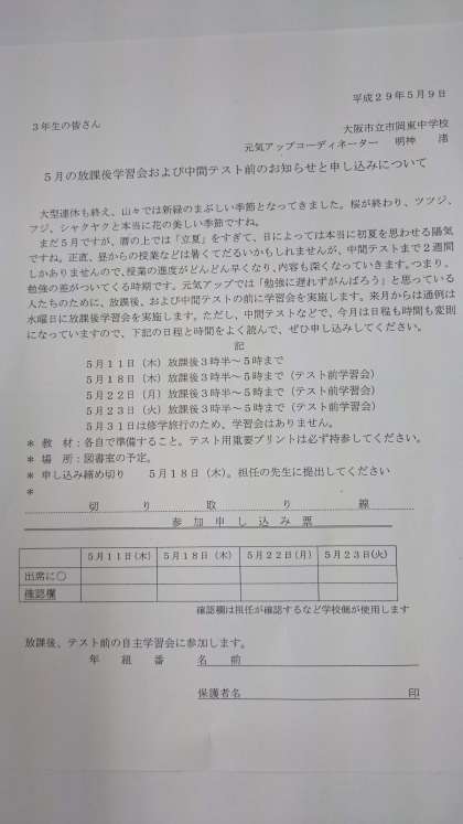 5月放課後学習会・中間テスト前学習会のお知らせ
