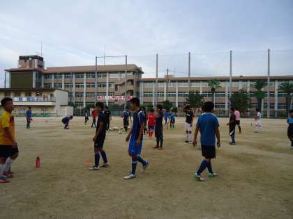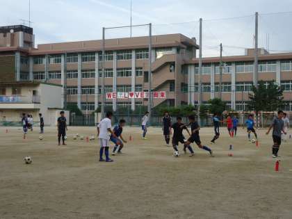 市岡高校サッカー部が本校のグラウンドで練習をしている様子です。市岡東中学校サッカー部員も希望者が数名参加しています。