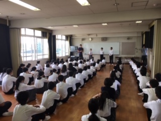 昨日の生徒会選挙について話があり、2年生から出た3人に前であいさつしてもらいました。