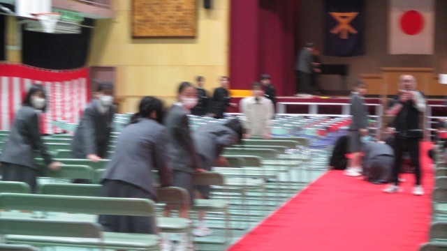 午後からの卒業式準備。1・2年生がそれぞれの役割を全うし、清掃や会場準備をしてくれ、卒業生を送り出す準備がすべて整いました。