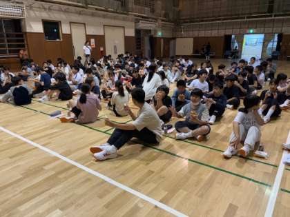 おはようございます。一泊移住2日目です。朝のつどいで全員集合しました。今の時点で体調不良者はいません。