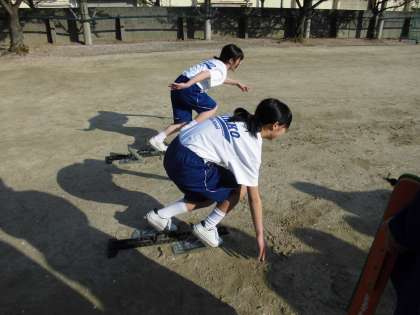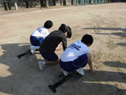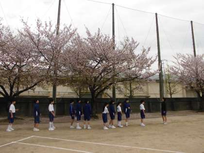 陸上部には7人もの新入生が来ました。先輩たちが付きっきりで指導にあたります。桜の木の下で気持ちよく走っていました。