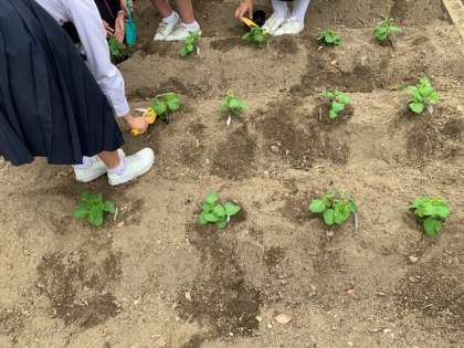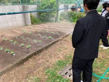 3年技術科で、先日ポットに植えた枝豆が発芽し、本葉が出てきました。今日畑に定植しました。畑は、学校元気アップの皆さんによって畝を作っていただきました。元気アップの皆さんありがとうございます。収穫は7月中旬を予定しています。収穫が楽しみです。