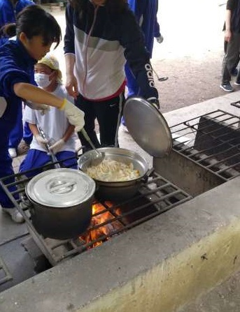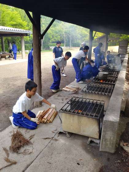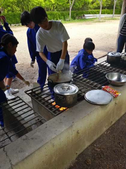 野外炊さんの様子です。班で協力して火をおこし、食材を切り、煮込んでカレーを作ります。写真からも分かるように、みんな真剣に取り組んでいます!