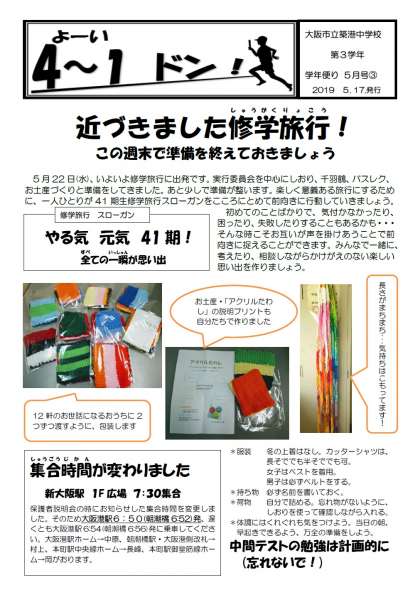準備は早めに読みにくい方はここをクリック⇒。3年学年だより5月号(修学旅行前)